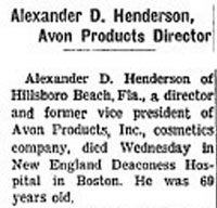 | July 10, 1964 | New York Times ran an article titled: Alexander D. Henderson, Avon Products Director. It said "Alexander D. Henderson of Hillsboro Beach, Fla., a director and former vice president of Avon Products, inc., cosmetics company, died Wednesday in New England Deaconess Hospital in Boston. He was 69 years old." Source: ProQuest Historical Newspapers, The New York Times pg. 29. | ![]() |